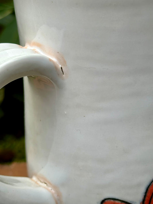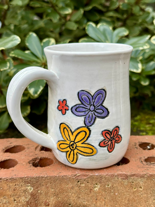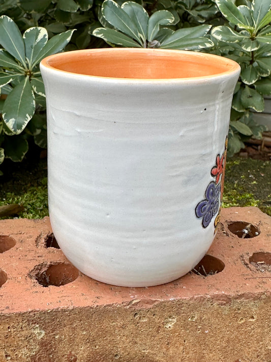 *Second* Ceramic Stoneware Carved Blue, Orange and Yellow Flowers Coffee Tea Mug Cup Botanical Floral Pottery