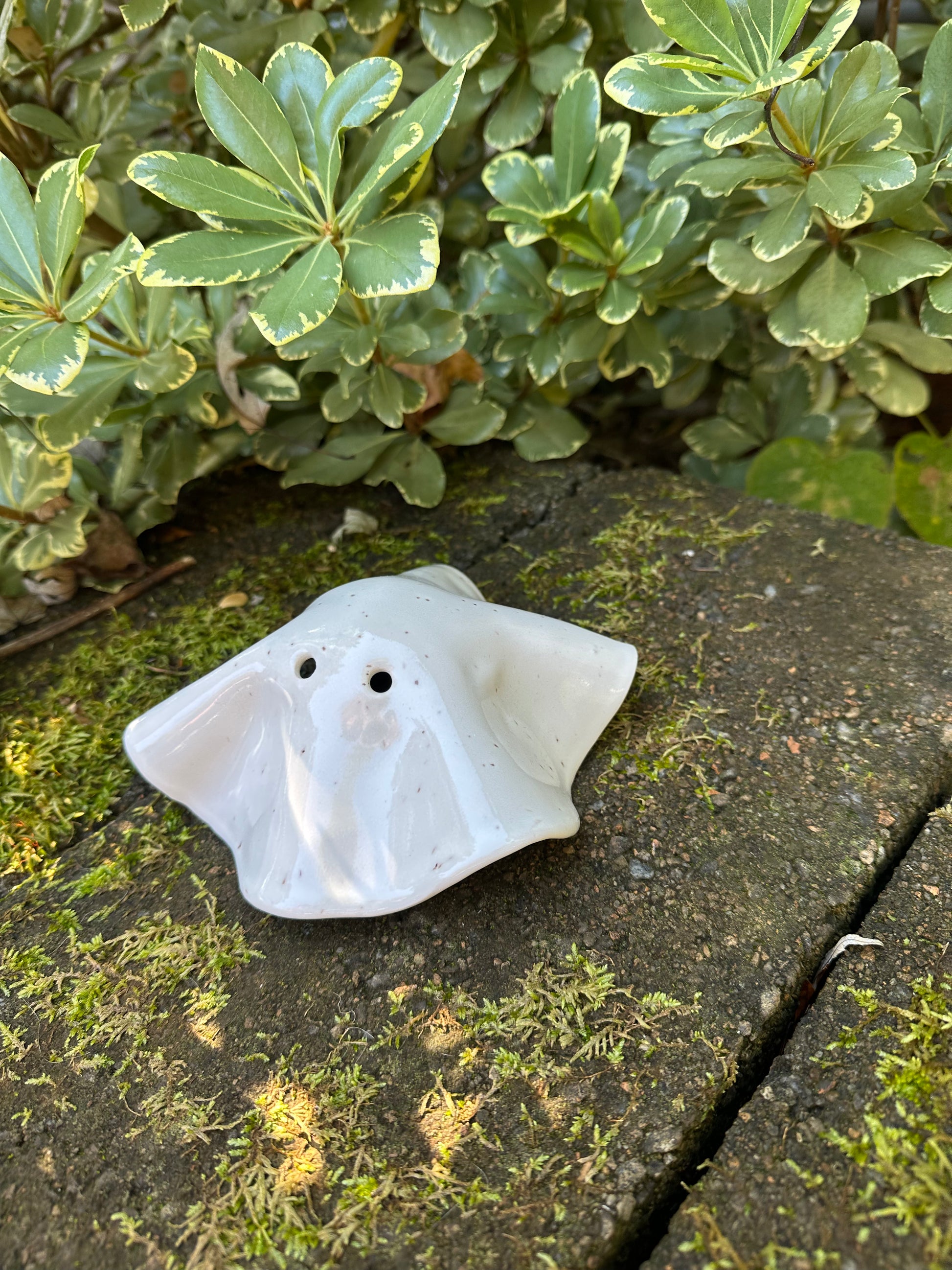 This particular ghost has white glaze and was made by hand to look like a bedsheet ghost.