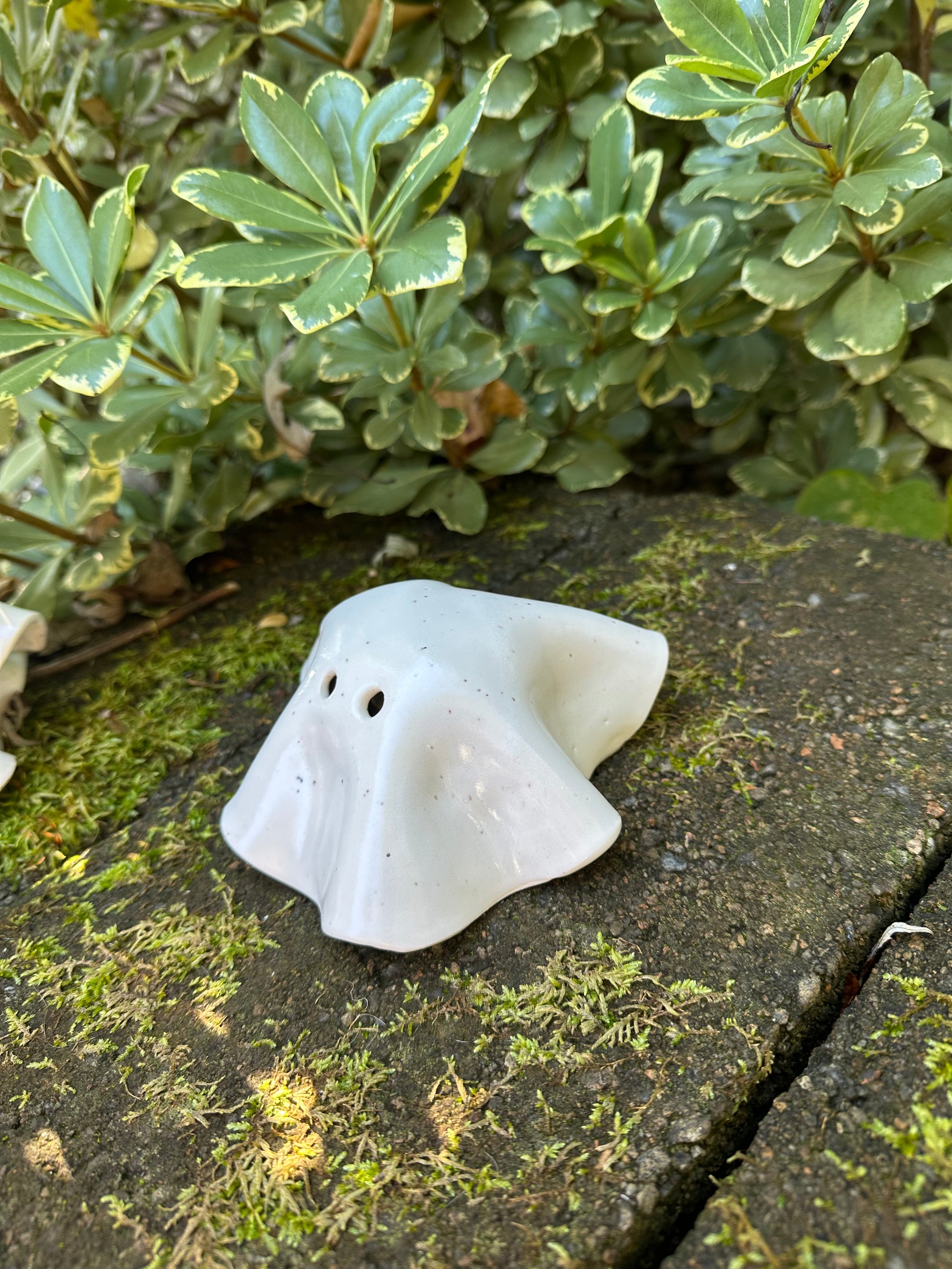 This particular ghost has white glaze and was made by hand to look like a bedsheet ghost.