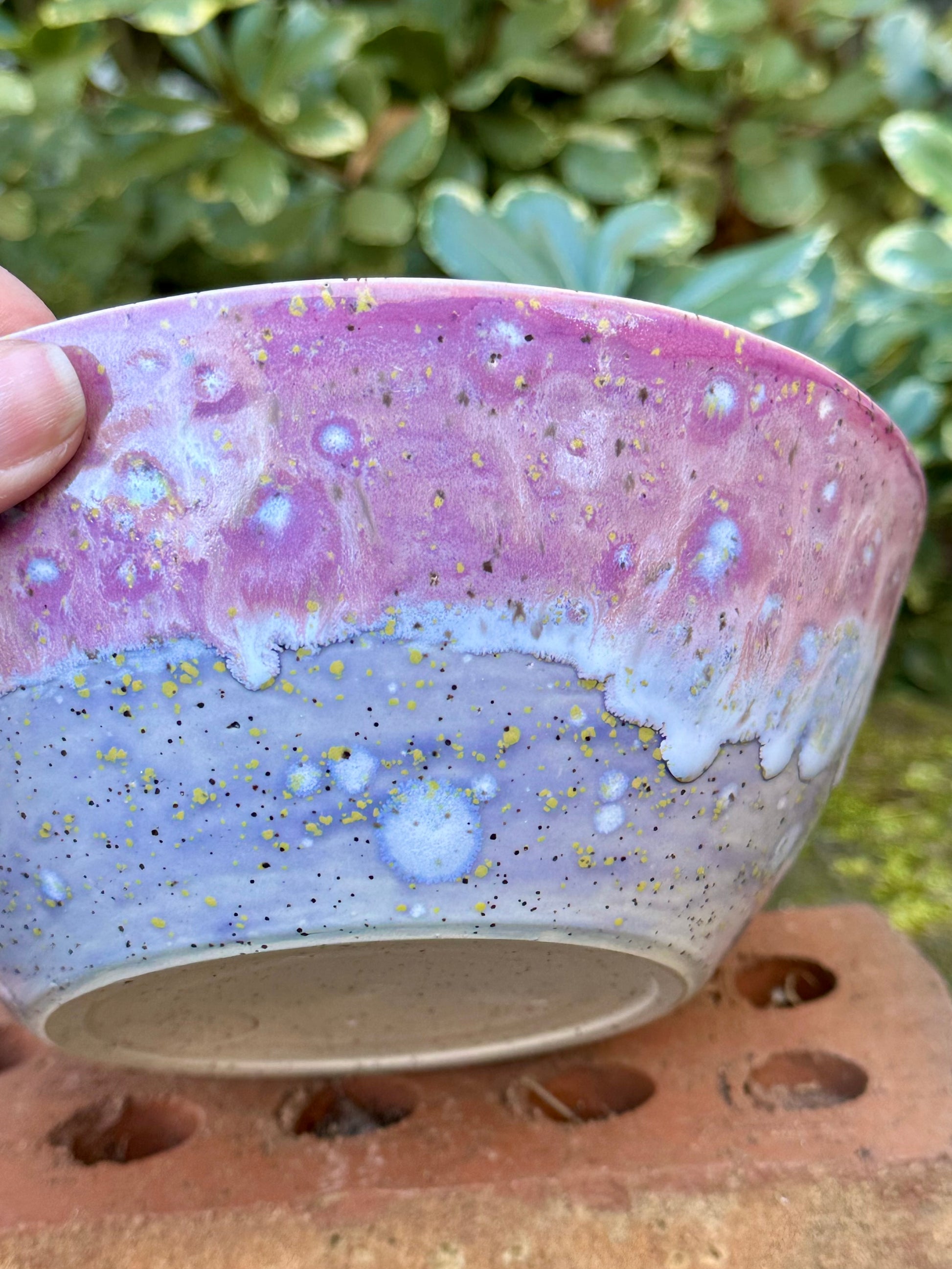 This particular bowl has pink and purple glaze layered on the exterior and pink glaze on the interior.