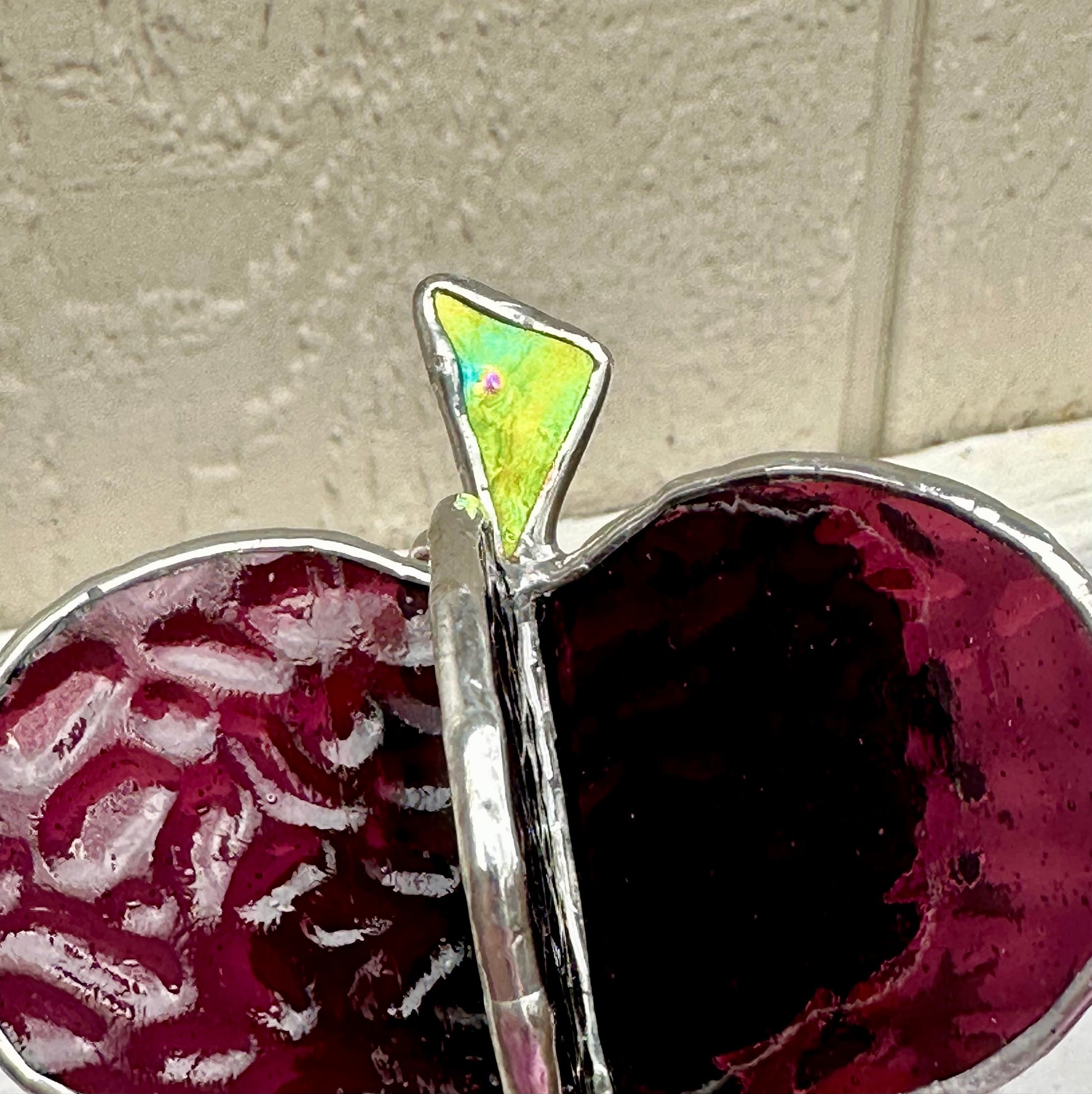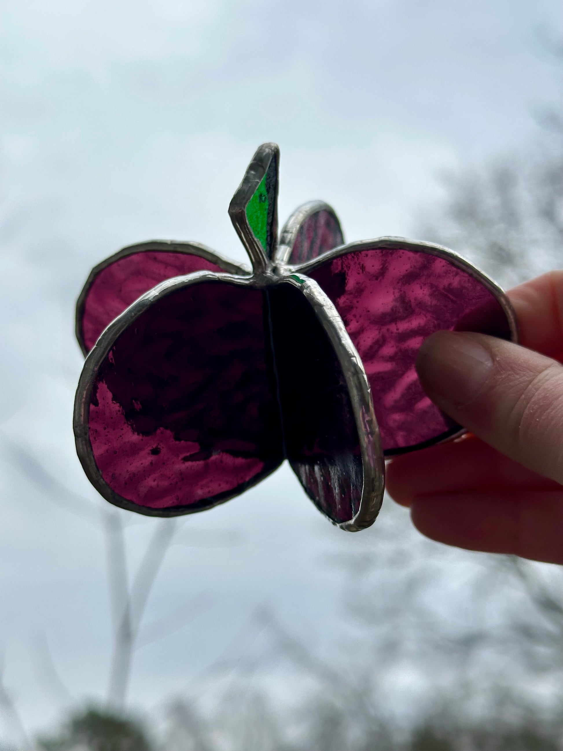 This particular 3D pumpkin is purple translucent glass with a green stem.